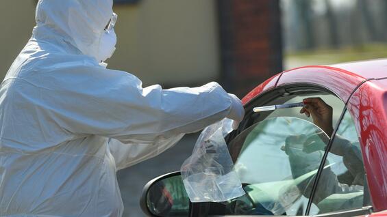 布兰登堡,身穿防护服的医生在进行测试。图片来源:PATRICK PLEUL/DPA-ZENTRALBILD/DPA